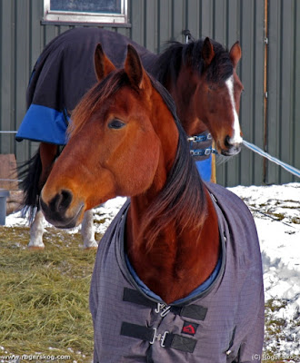 Her kan du se noen hester som koser seg ute i sola i Dividalen i Målselv.